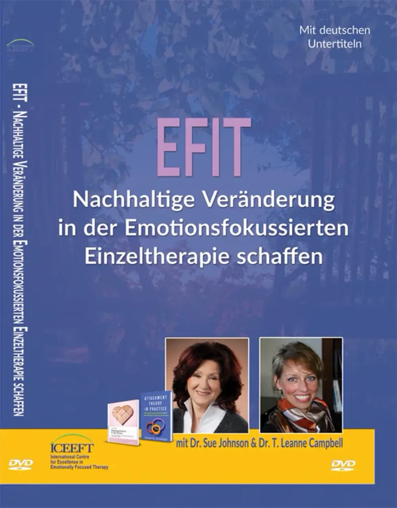 Diese EFIT – Nachhaltige Veränderung in der Emotionsfokussierten Einzeltherapie schaffen DVD ist unserer Meinung nach momentan das beste Beispiel für EFT-Einzeltherapie (Stand Ende 2020). Es zeigt eine Reihe von EFIT-Therapiesitzungen angeleitet von Dr. Sue Johnson und Dr. T. Leanne Campbell. Zunächst werden die beiden Klientinnen Natalie und Melissa vorgestellt, die an den emotionalen Störungen Angst und Depression leiden. Anschließend wird die grundlegende Interventionssequenz, der EFT-Tango, mit jeder Klientin dargestellt. Sue Johnson und Leanne Campbell besprechen zudem die Sitzungsausschnitte und heben Schlüsselmomente im Veränderungsprozess hervor.