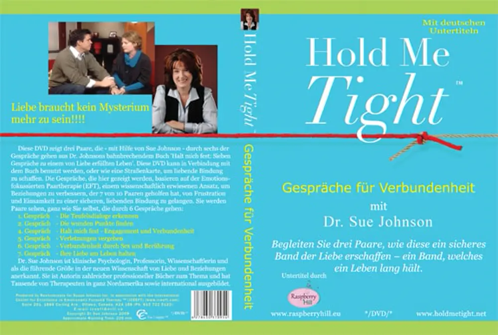 Diese Hold Me Tight – Gespräche für Verbundenheit mit Dr. Sue Johnson DVD begleitet das „Halt mich fest“-Buch und zeigt drei Paare, die mit Hilfe von Sue Johnson sechs Gespräche führen. Diese DVD kann allein als Roadmap für die Herstellung einer liebevollen Verbindung oder zusammen mit dem Buch angewandt werden. Für viele unserer Klient*innen war es eine große Erleichterung, sowohl weil sie erkannt haben, dass andere Menschen sich in die gleichen negativen Muster verfangen, als auch weil sie die EFT-Roadmap kennengelernt haben, die gestresste und unsichere Liebesbeziehungen in sichere Häfen verwandeln kann.