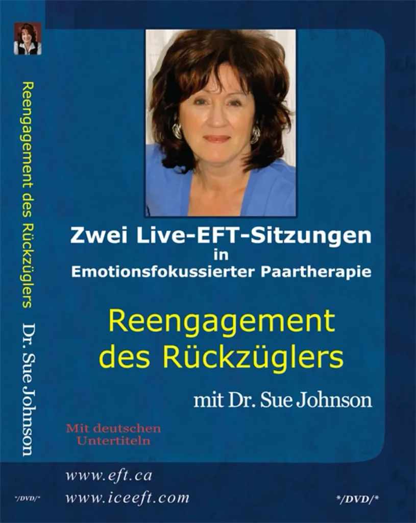 Die Sitzungen auf dieser Reengagement des Rückzüglers DVD wurden häufig bei EFT Externships verwendet. Gezeigt wird Sue Johnsons Arbeit mit zwei Paaren – John & Julia und Juli & Lee. Beide Paare befinden sich am Anfang der 2. Phase, daher vermittelt das Anschauen dieser Sitzungen einen guten Eindruck davon, was die Paare mit Hilfe ihrer Therapeut*innen in Phase 1 abarbeiten konnten und wie die Arbeit zu Beginn von Phase 2 aussieht. Man sieht, wie Sue Johnson dem zurückgezogeneren Partner hilft, seine verletzlichen Gefühle zu verstehen und auszudrücken. Dies muss geschehen, bevor der verfolgendere Partner*in aufgefordert werden kann, sich zu öffnen und erhebliche emotionale Risiken einzugehen.